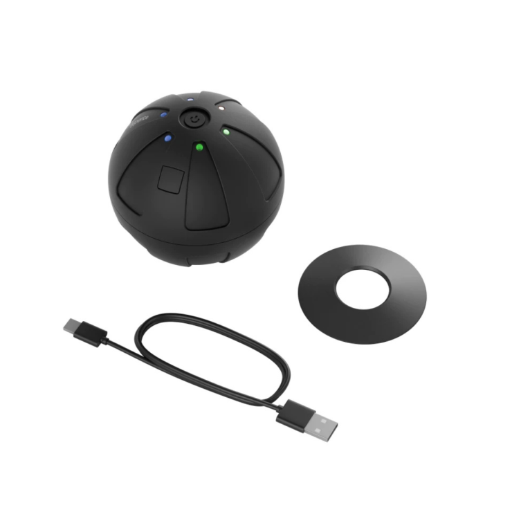 Contenu du coffret : 1 balle de massage vibrante Hypershere Go, 1 câble USB-A vers USB-C, 1 support de bureau