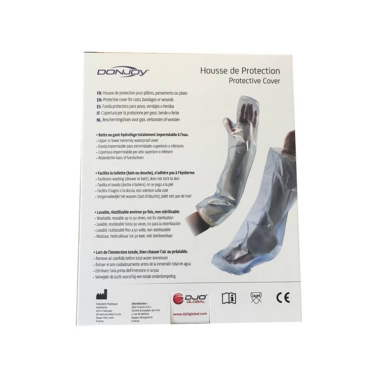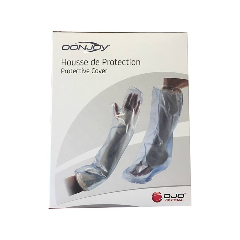 Housse de protection pour plâtres, plaies ou pansements de la marque Donjoy. Utilisation facile sous la douche, le bain, à la plage, à la piscine… Totalement imperméable à l'eau !