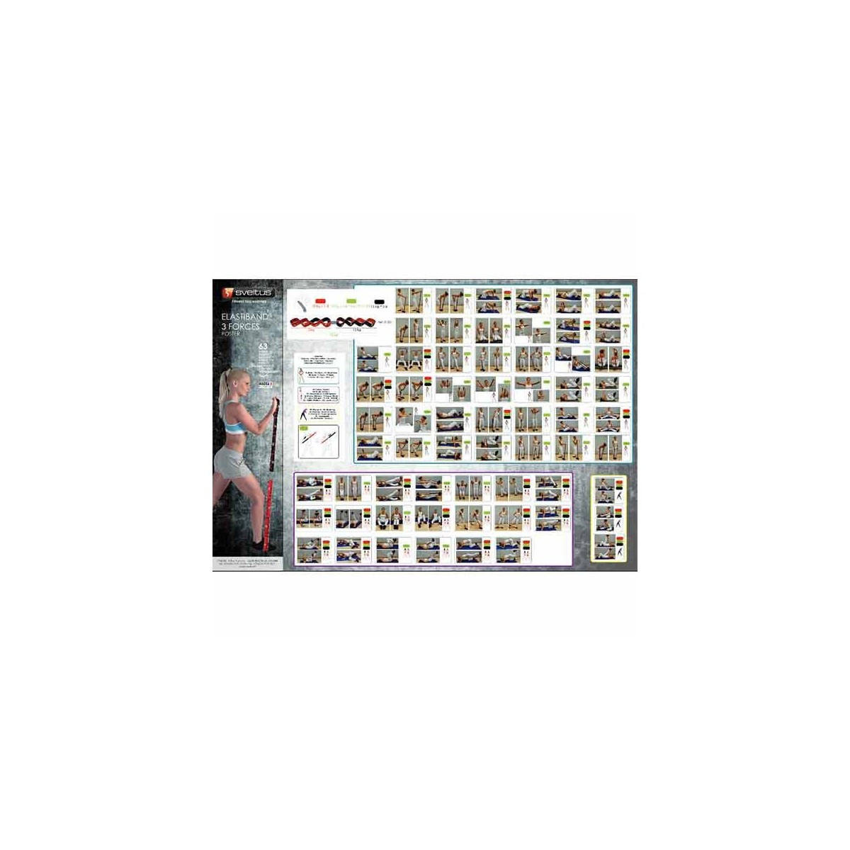 Ce poster vous fournit toute une liste d'exercices à pratiquer avec l'élastique fitness Elastiband 3 forces.