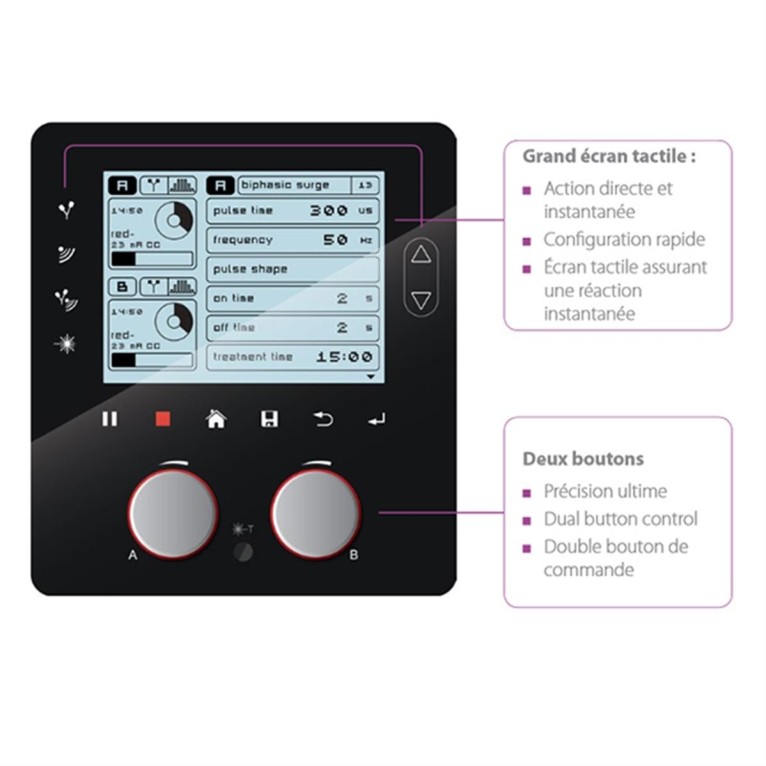 Appareil de thérapie combinée électrostimulation et ultrasons. 2 canaux indépendants, écran tactile, nombreux programmes.
