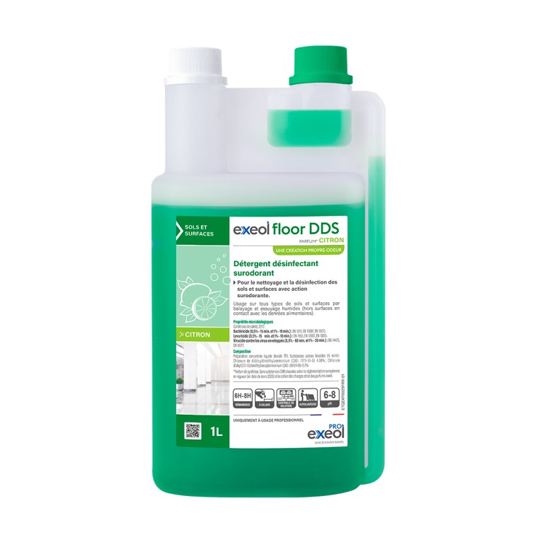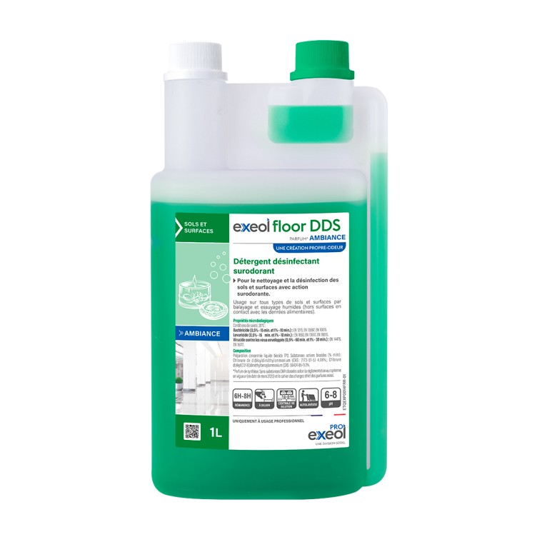 Exeol FLOOR DDS – Détergent désinfectant surodorant, spécialement conçu pour le nettoyage et la désinfection des sols et surfaces, tout en laissant un parfum longue durée jusqu'à 8 heures. Compatible avec tous types de sols et surfaces, il s’applique par balayage ou essuyage humide (hors contact avec les denrées alimentaires). Disponible en plusieurs formats et deux parfums.