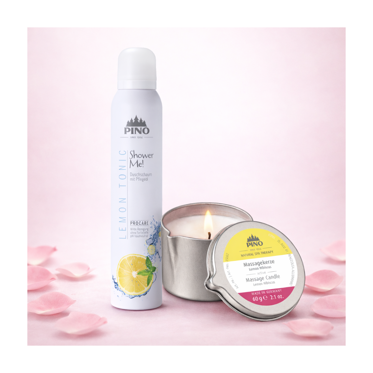 Mousse de douche Citron Tonic & Bougie de massage Citron Hibiscus