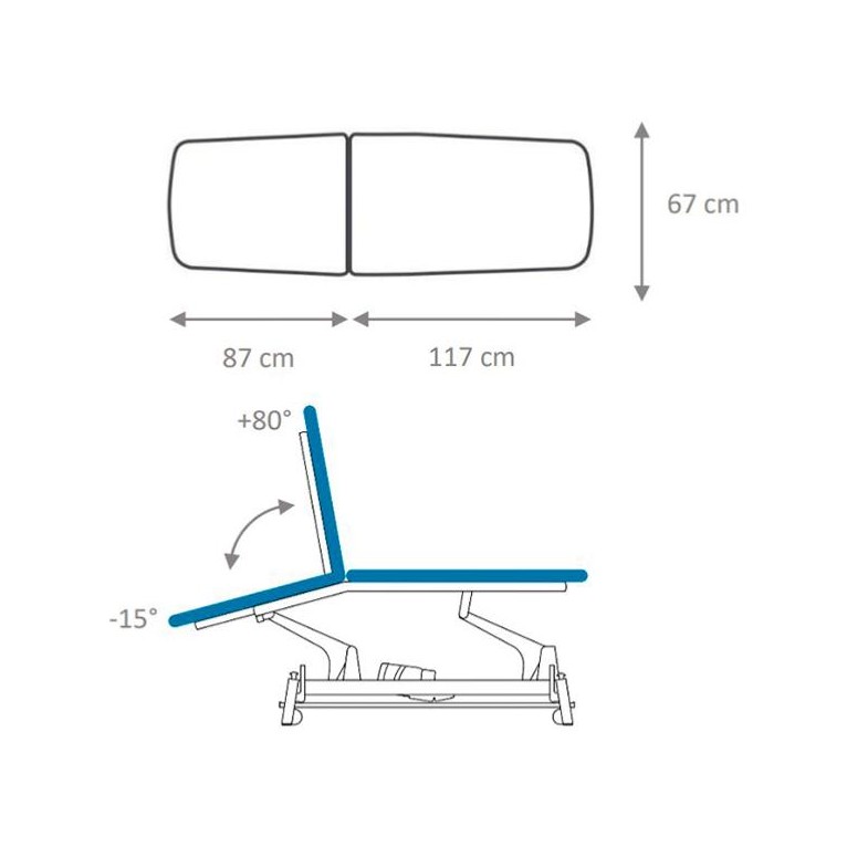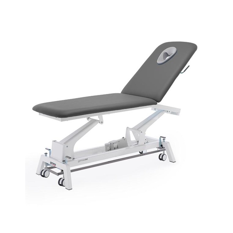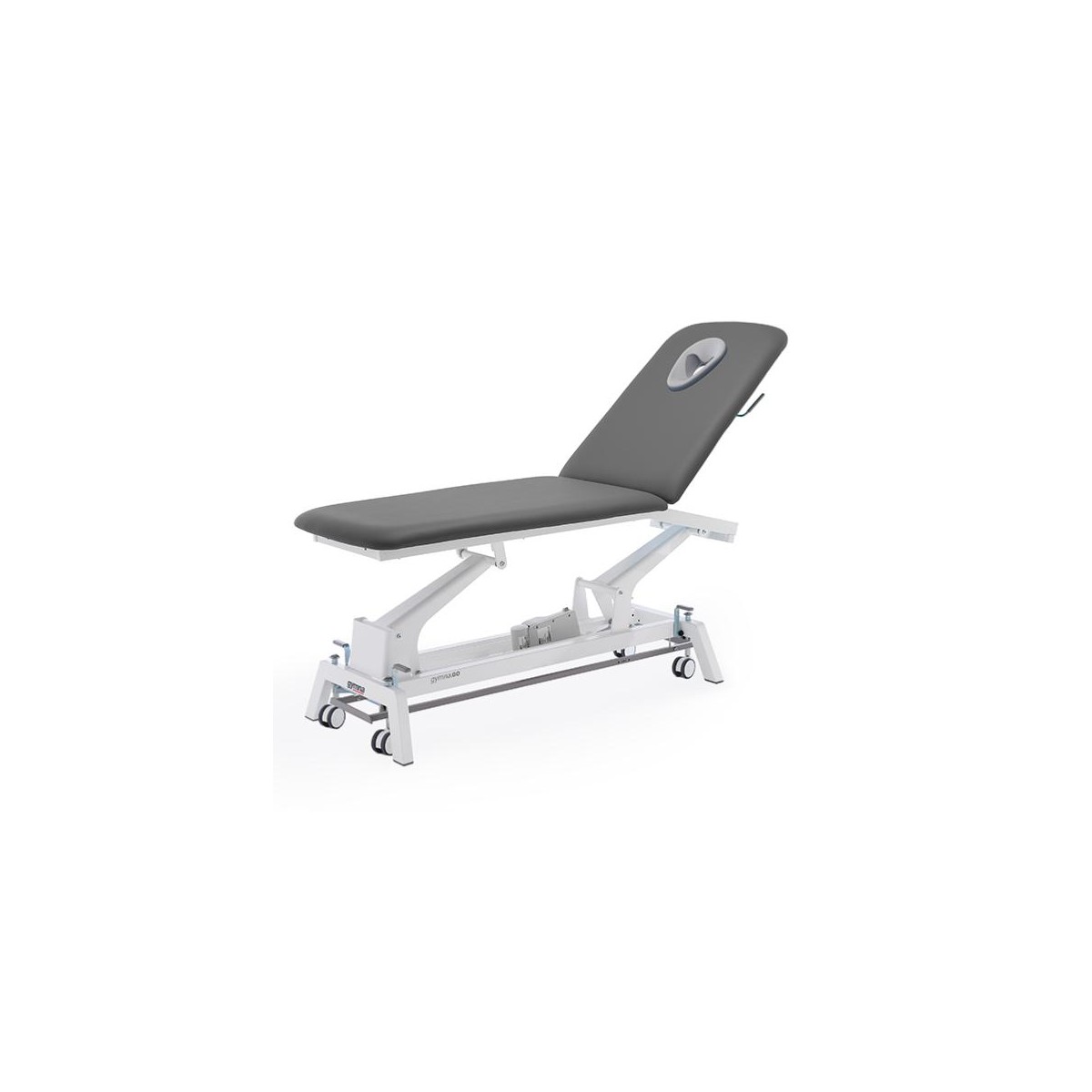Table de massage 2 plans sans roulettes avec grand dossier et réglage électrique de la hauteur avec commande à pied (système I-control).