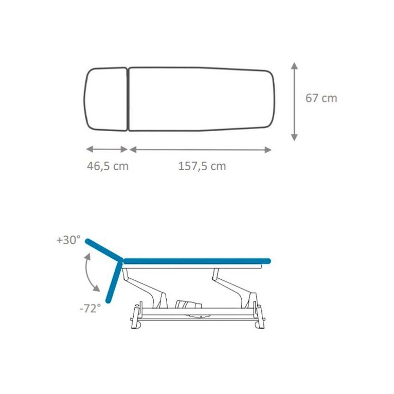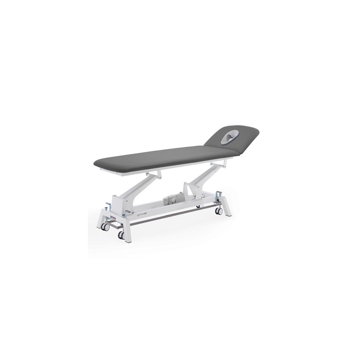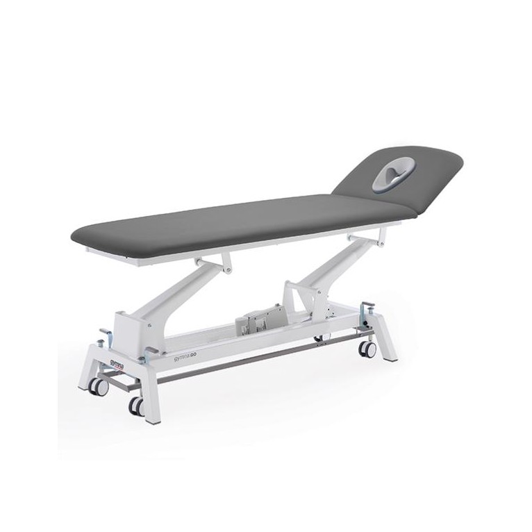 Table de massage 2 plans sans roulettes avec têtière courte (réglable) et réglage électrique de la hauteur avec commande à pied (système I-control). Gymna.GO, la nouvelle gamme de tables de massage d’entrée de gamme.