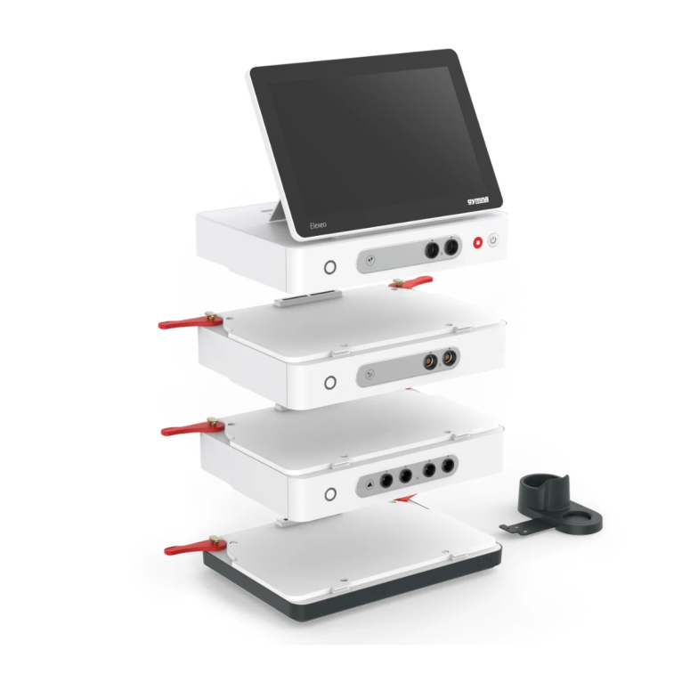 Le Elexeo Combi V GYMNA combine électrothérapie (TENS, NMES, microcourants), ultrasonothérapie (US, LIUS, LIPUS) et module Vaco à électrodes à vide pour une prise en charge complète en cabinet de kinésithérapie.