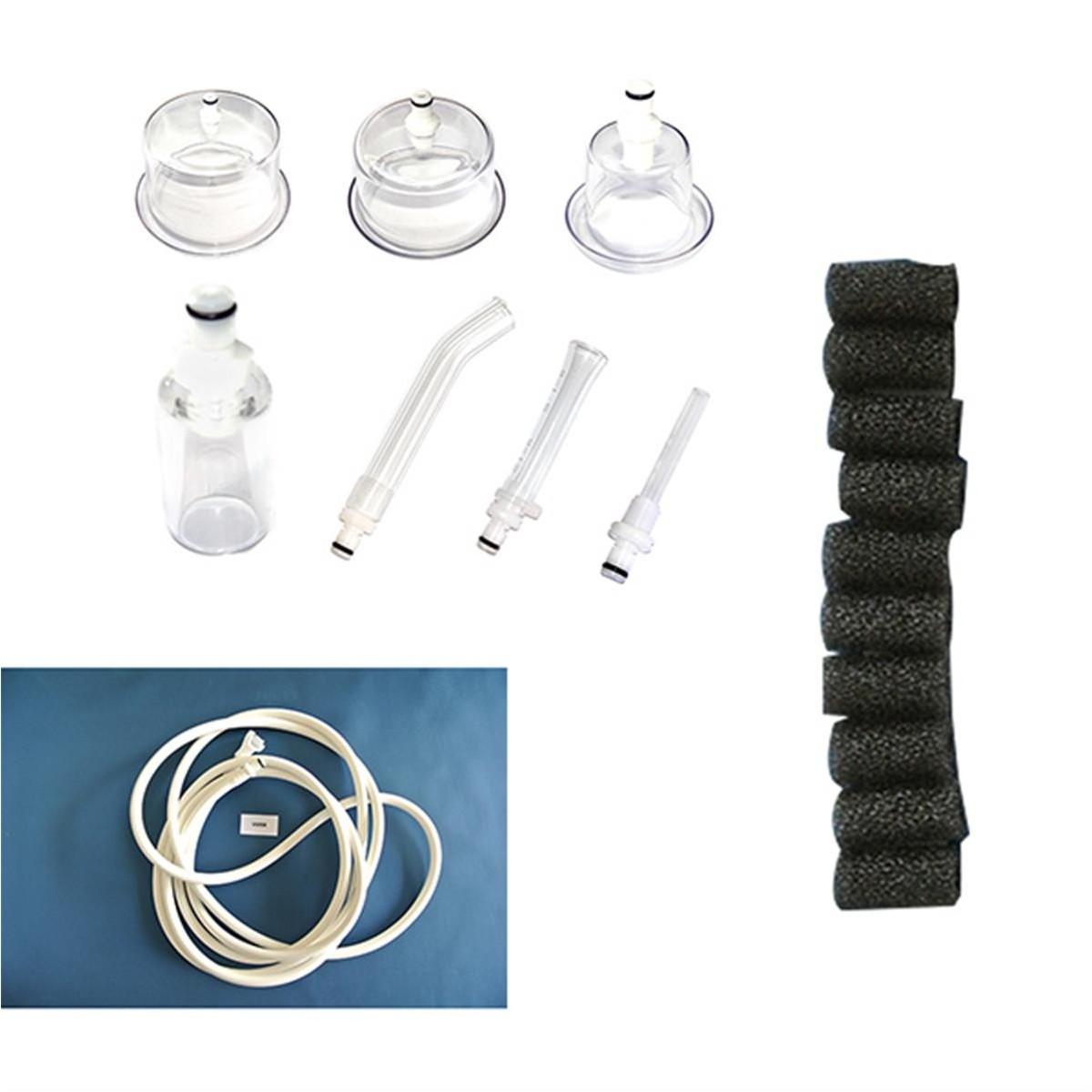 Ce kit d'accessoires contient des têtes d'aspiration, un tube de liaison et des filtres qui fonctionnent uniquement avec l'appareil de dépresso-massage TV10 Eureduc.